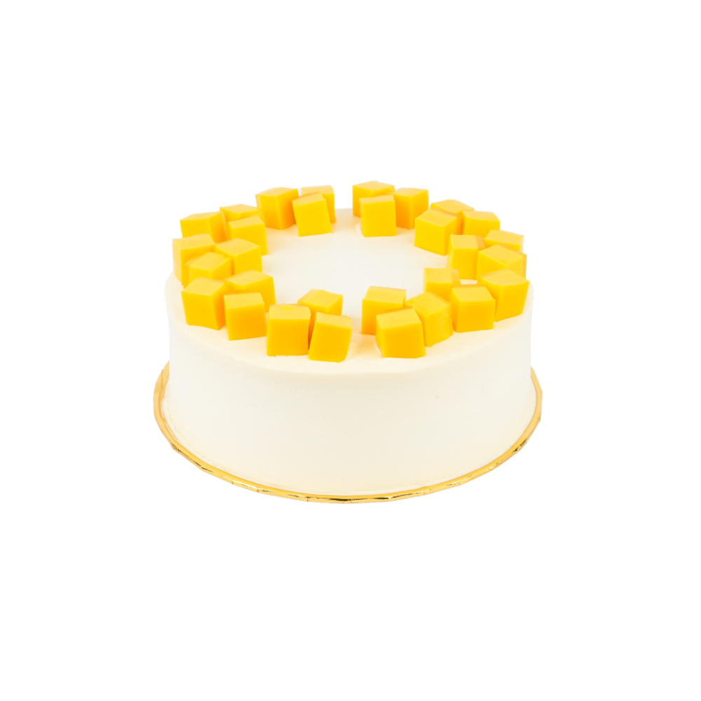Vanilla sponge cake layered with passion chantilly and mango fruit. Decoration with cube of mango pudding on top.