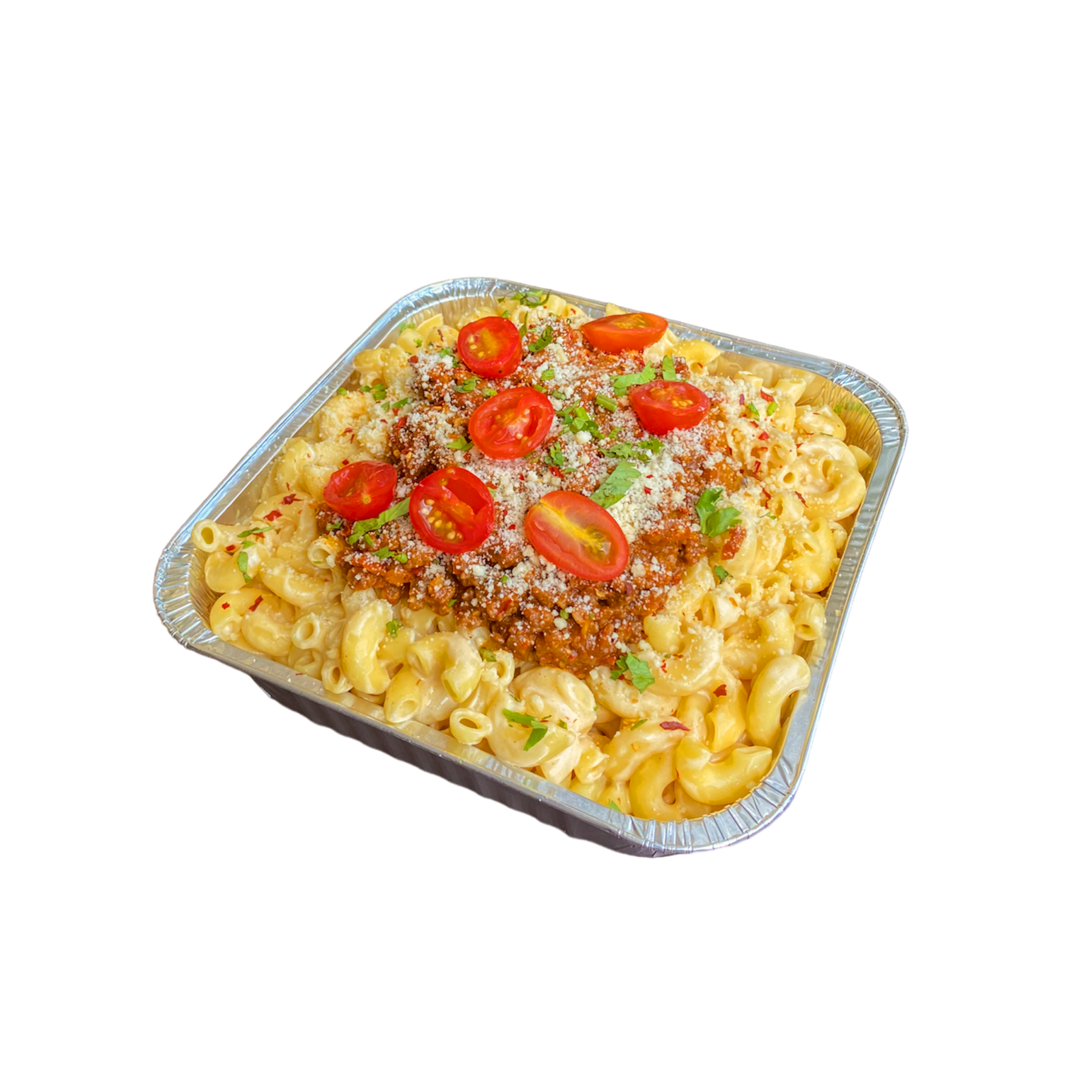 -Macaroni served with creamy cheesy sauce and topped with beef bolognese sauce, chili flakes, parmesan cheese and shredded mozarella.